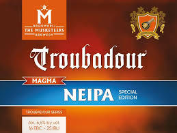 Le caractère trouble de Troubadour Magma NEIPA s’accorde parfaitement avec les saveurs très fruitées et houblonnées que l’on perçoit immédiatement avant même de déguster la bière. Un corps malté moyen avec quelques notes de caramel se combine à un fruité juteux. On distingue clairement un goût d’orange, d’ananas, quelques notes d’agrumes et de citron. Brasserie THE MUSKETEERS (Belgique